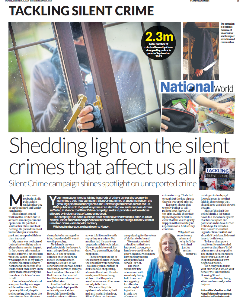 2024In September 2024, National World launched its campaign Silent Crime to give victims a voice – and to demand that those in power listen. Across every newsroom, National World pledged to tell the stories of those who felt let down, or excluded, from justice, those who were told that there were no witnesses, no evidence to pursue or simply not enough resources to seek justice.