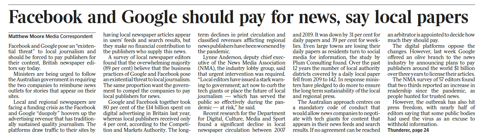 A survey of local editors conducted by the NMA found that local editors overwhelmingly believe that Government should intervene to make Google and Facebook pay for news.
