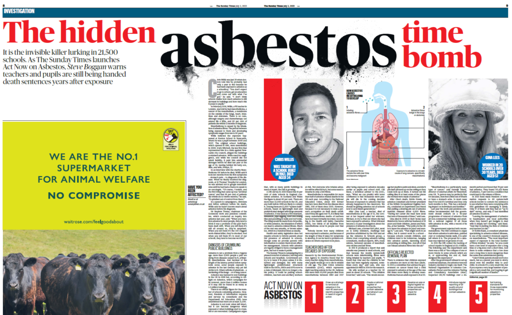 The Sunday Times reported: “Government policy is to leave asbestos where it is unless it is disturbed and damaged, releasing fibres. But with many prefab structures built in the 1950s, 1960s and 1970s now falling into disrepair, this is no longer acceptable. And, as Michael Lees, the widower of a teacher who died of mesothelioma aged just 51, pointed out, even if school buildings are in good condition, the policy does not take behaviour into account.”